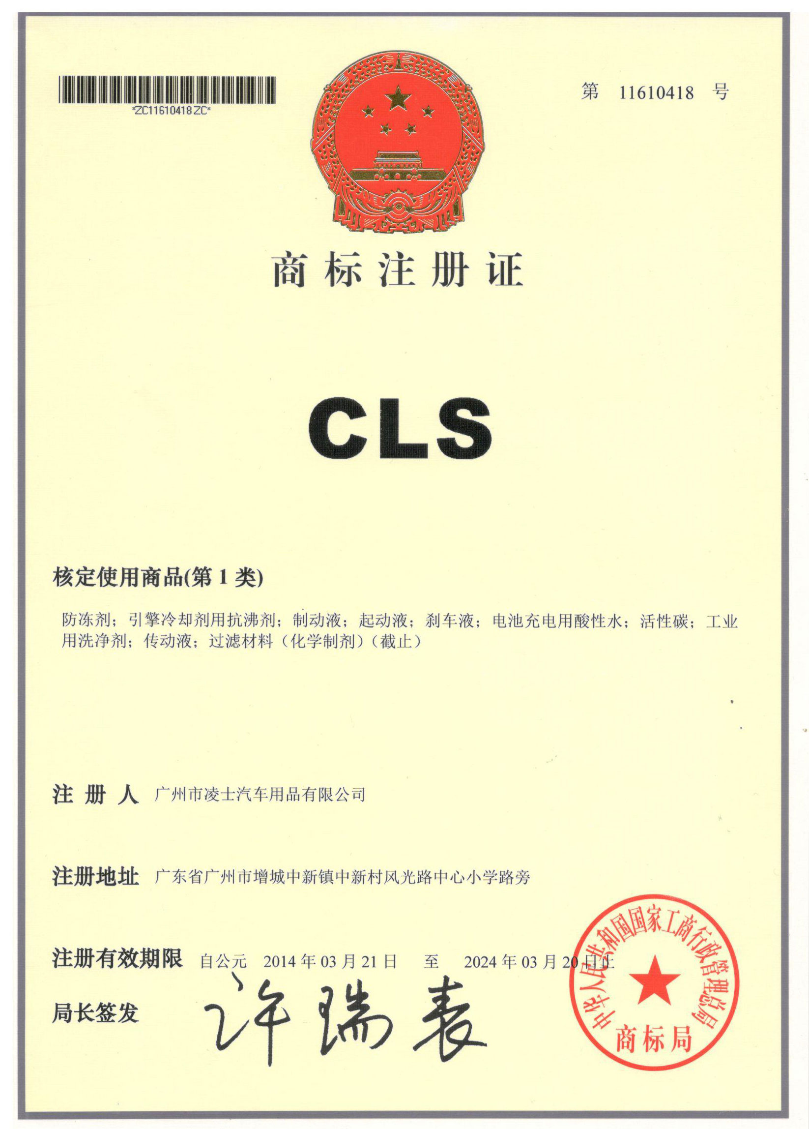 CLS商標(biāo)注冊(cè)證
